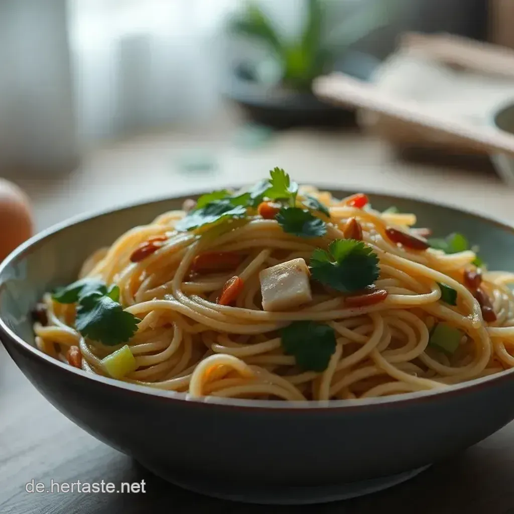 Hast du schon mal über Farben nachgedacht? Kombiniere die goldenen Nudeln mit dem knallgrünen Koriander und dem hellen Gemüse. Das bringt Frische und macht das Gericht noch ansprechender.