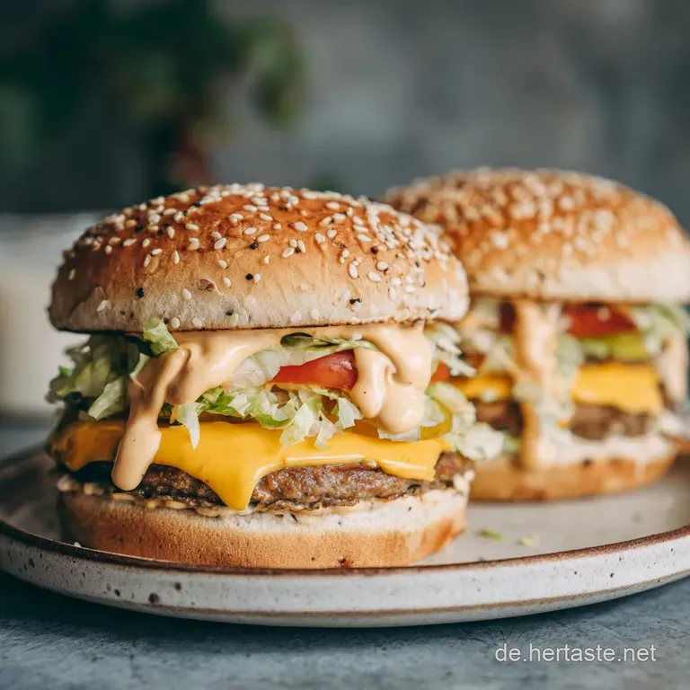 Die spezielle "Special Sauce", die eine Emulsion auf Mayonnaisebasis ist. Sie ist cremig, leicht süßlich und hat durch den Essig und die Gewürze eine deutliche Säurenote, die sie von einfachen Burgersaucen unterscheidet.