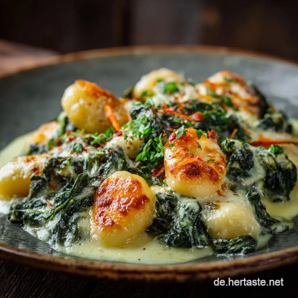 Dieser Auflauf ist eine herrliche kulinarische Begegnung zwischen der italienischen Kartoffelkunst und deutscher Cremigkeit, die auf dem Tisch einen echten Seelenwärmer darstellt. Wir nutzen die zarten Kartoffelgnocchi, deren Textur wunderbar zur reichhaltigen Rahmspinatbasis passt.