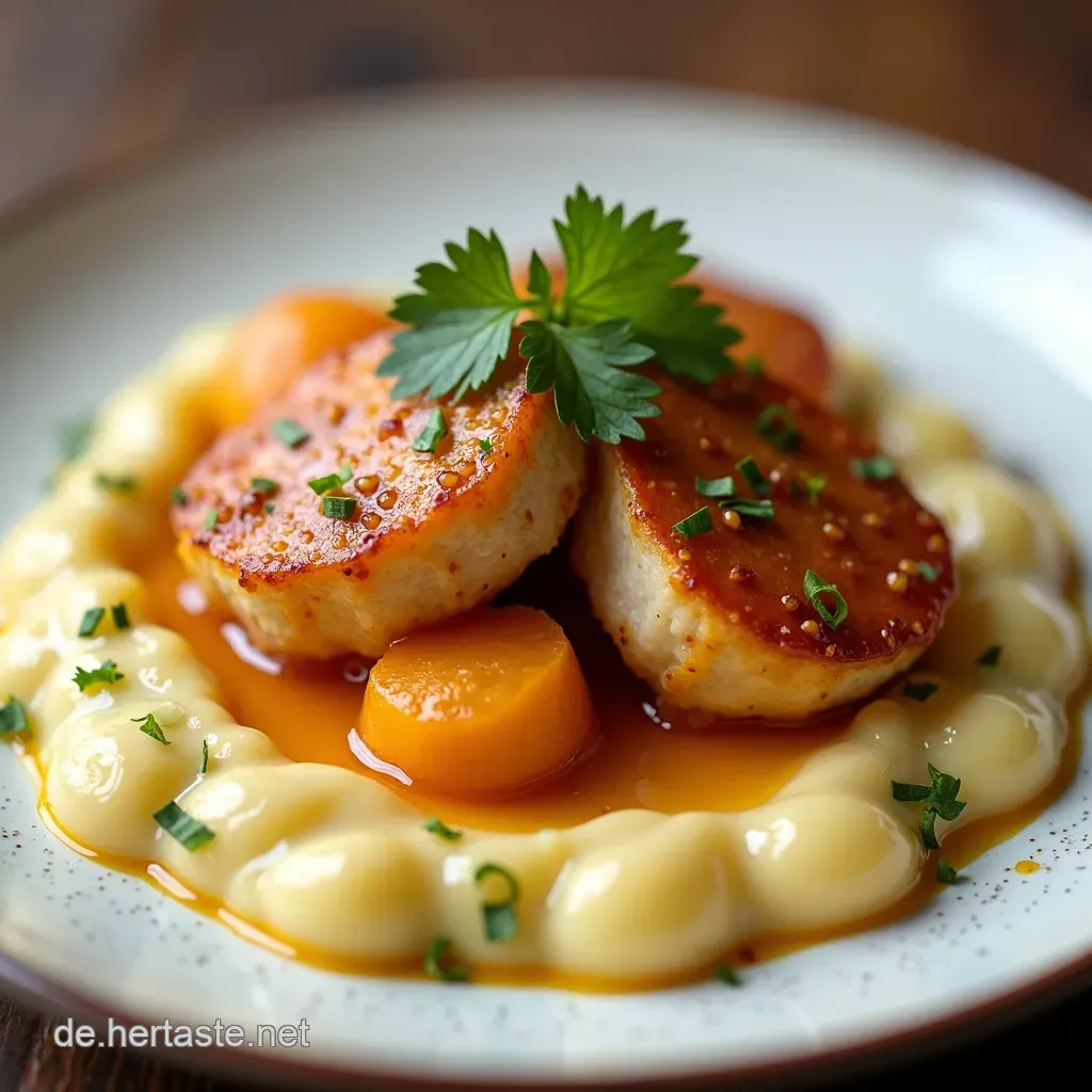 Wenn ich dieses Abendessen Rezepte koche, will ich, dass es nicht nur schmeckt, sondern auch gut aussieht. Das ist Teil der Freude! Nimm einen tiefen Teller und gib zuerst eine großzügige Portion vom Cremiges Kartoffelpüree Geheimnis in die Mitte.