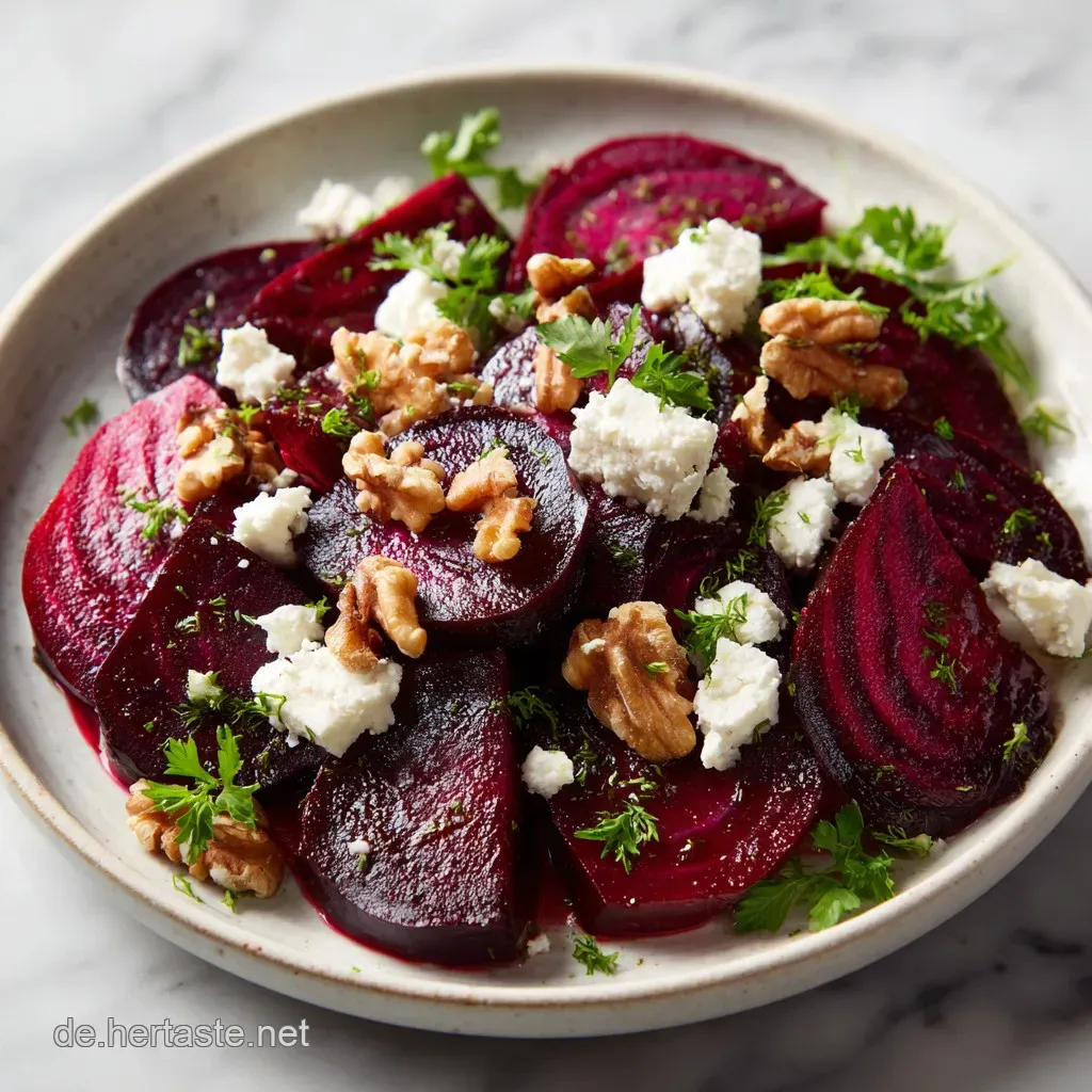 Gegrilltes Lamm oder dunkles Sauerteigbrot. Die erdige Süße der Bete harmoniert exzellent mit herzhaften Fleischsorten, während Brot die Dressingreste aufsaugt. Für eine leichte Ergänzung probieren Sie einen frischen, knackigen Salat wie unseren KichererbsenSalat mit Feta rezept, um die salzige Komponente zu wiederholen.