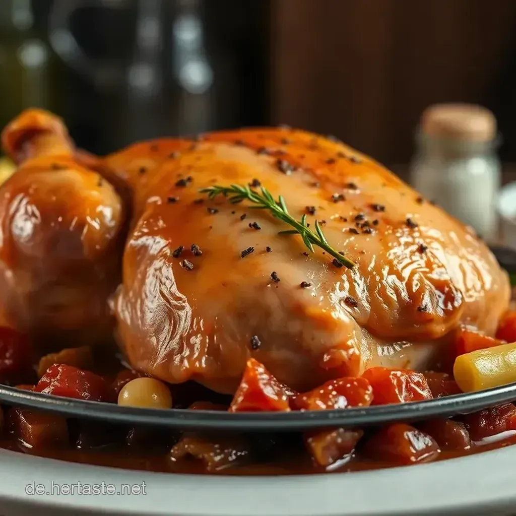 Das „Hähnchen Pampered Chef“ ist besonders saftig und zart, da es im Dutch Oven langsam geschmort wird. Diese Zubereitungsart sorgt für intensiven Geschmack und eine wunderschöne, saftige Textur perfekt für ein gemütliches Familienessen im deutschen Stil.