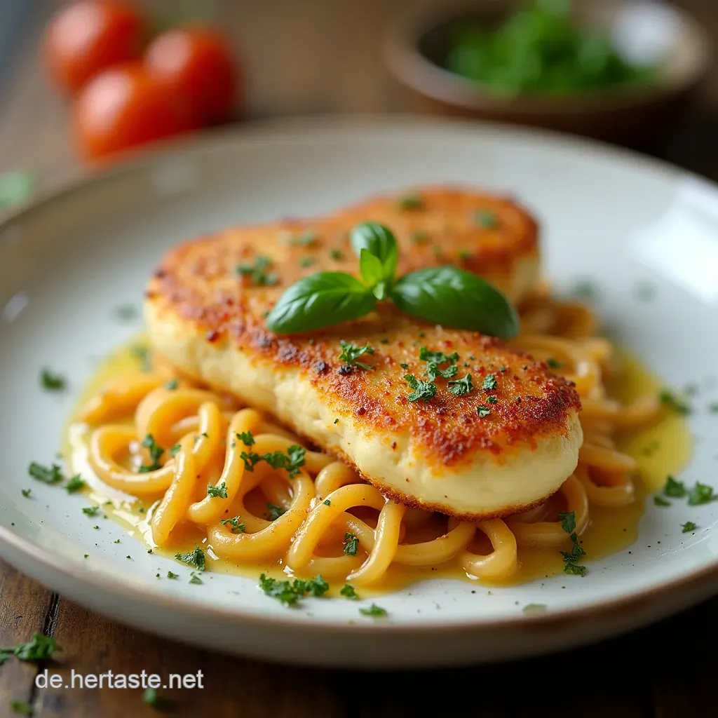 Drücken Sie die vorbereitete Kräuter Parmesan-Mischung fest auf die Oberseite. Sie muss haften, da sie sonst beim Wenden in der Pfanne verbrennen oder abfallen könnte. Die Unterseite wird später direkt dem heißen Fett ausgesetzt.